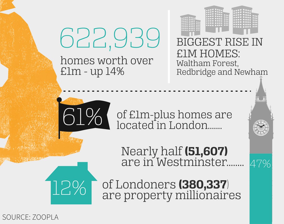 Research released by property website Zoopla said the number of homes worth £1m or more increased by 75,796 – up 14 per cent – since January, taking the total number of property millionaires to 622,939.