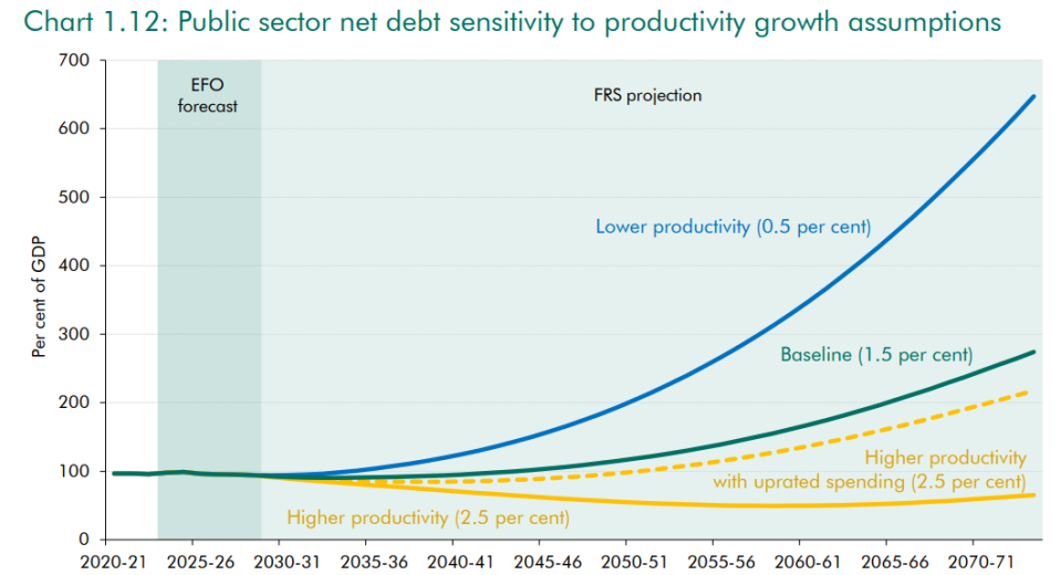 Productivity, which measures output per hour, is the engine of economic growth. If productivity growth were to return to its pre-financial crisis levels – and the government used the proceeds to pay down debt – that would keep debt below 100 per cent of GDP for next 50 years.