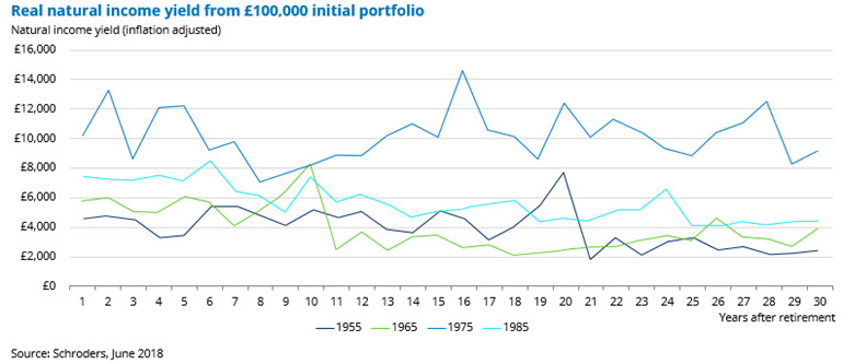 The chart below shows how volatile the natural yield method can be over a 30-year period. The portfolio consists of 50 per cent equities and 50 per cent bonds which are rebalanced annually to maintain that split. We applied the Barclays Equity-Gilt Study which has 115 years of market returns data.