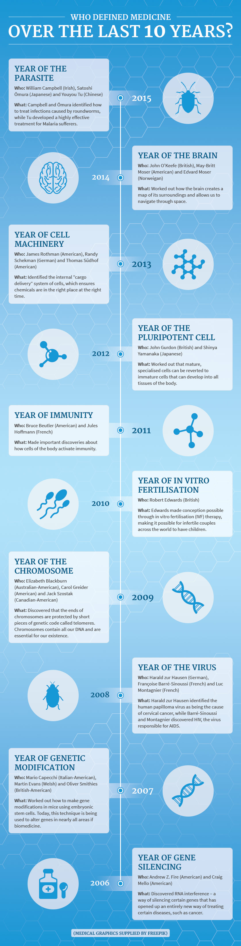 Here's a look back in time at the winners from the last 10 years, and the contributions they made to science, from genetic manipulation to ground-breaking infertility treatment.