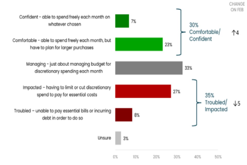35 per cent said their finances were troubled or impacted, compared to 30 per cent who said they were comfortable or confident.
