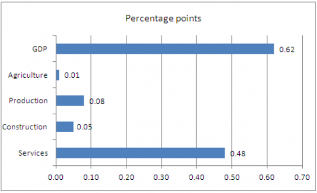 GDP is still 3.3 per cent below its first quarter 2008 peak, and this figure is in line with average quarterly growth since 1955 (at ~0.64 per cent). It's the first quarter since the third quarter of 2011 that all four quarters have seen growth.