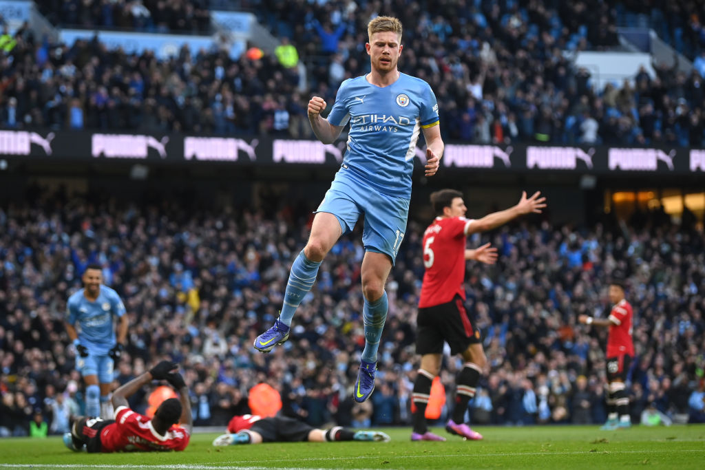 Both of City’s first-half goals came through De Bruyne to triple his return of goals in Manchester derbies – previously one goal in 12 appearances – while Riyad Mahrez’s first of two was assisted by the Belgian playmaker.