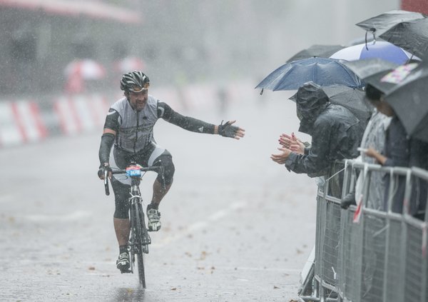 The wet start failed to deter riders, and weather conditions improved briefly for some cyclists crossing the finish line.