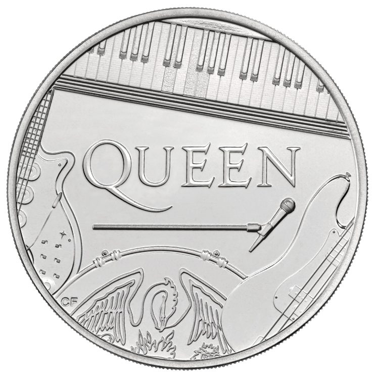 The coin commemorates all four members of the band and includes their instruments. The group’s logo is placed in the centre, underscored by singer Freddie Mercury’s signature microphone stand.