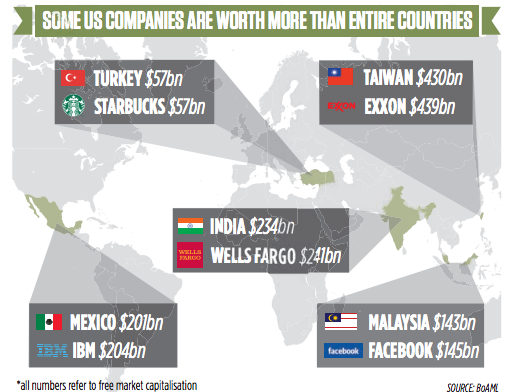 FACEBOOK is worth $2bn (£1.21bn) more than all Malaysia’s listed firms; while oil giant Exxon’s market value outstrips Taiwan’s by $9bn, according to a note from analysts at Bank of America Merrill Lynch (BAML).