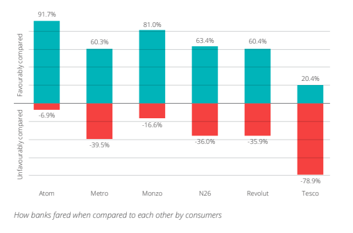 The pair were the only banks to receive more praise than complaints in an analysis of around 120,000 tweets about Metro Bank, Atom Bank, Monzo, N26, Revolut and Tesco Bank.
