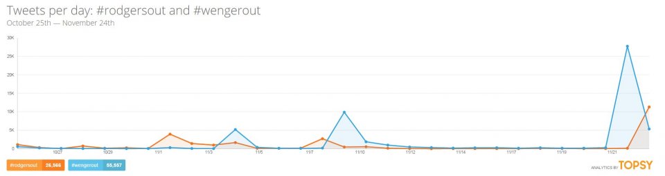 In the last month alone the Twitter hashtags #WengerOut and #RodgersOut have been tweeted over 80,000 times, with both reaching a peak this weekend according to social analytics tool Topsy.