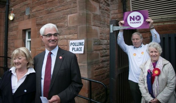 All eyes, though, were on the leaders of the Yes and No campaigns. Here's Alistair Darling doing his duty in Edinburgh: