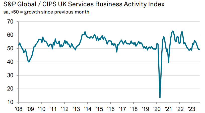 The services purchasing managers’ index (PMI), compiled by S&P Global and CIPS, fell marginally to 49.3 last month, down from 49.5 in August. The 50 mark separates growth and contraction.