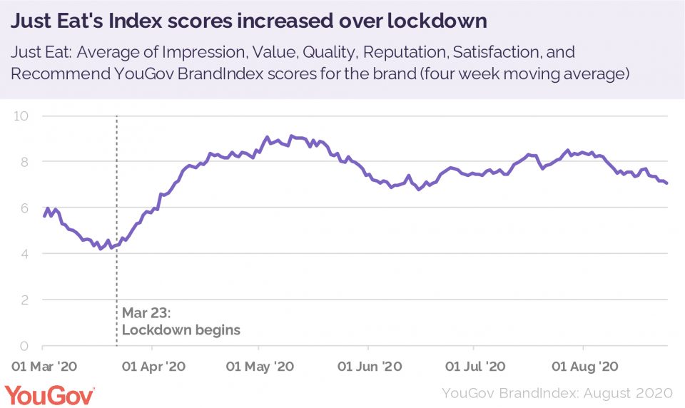 Even though restaurants have reopened – and with the added incentive of a discount through the Government’s Eat Out to Help Out scheme – Just Eat has held on to some of these gains. The company’s overall Index score was at 7.4 by August 21st, and while Purchase Intent has also fallen from its peak, it hit 8.6 on the same day; still meaningfully higher than it was at the beginning of lockdown. Across some metrics, customer opinion actually appears to have improved: Quality scores (a net measure of whether consumers think the brand represents good or poor quality) rose from 1.8 (March 23rd) to 5.3 (August 2nd).