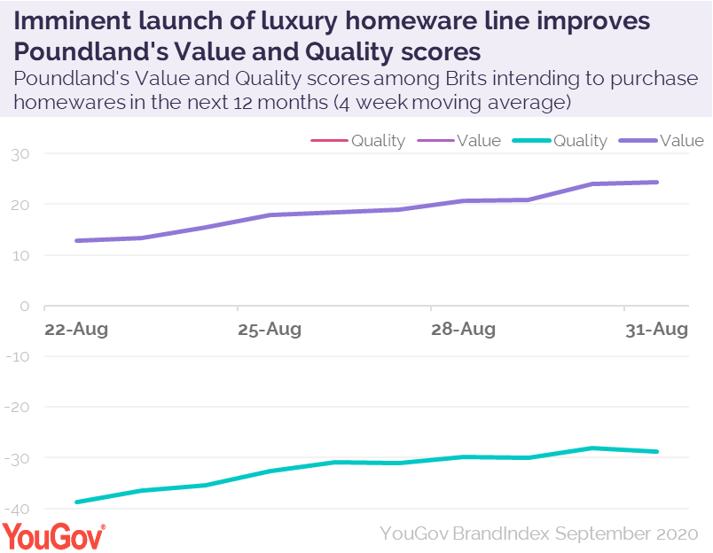 YouGov BrandIndex data shows that in the last 10 days, Poundland’s Value scores among those that are intending to purchase homewares and soft furnishings in the next 12 months has increased from 12.9 to 24.3. Similarly Poundland’s Quality scores among this group have also increased from -38 to -28.8.