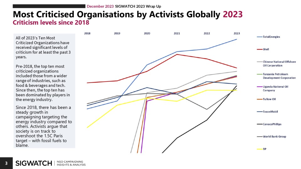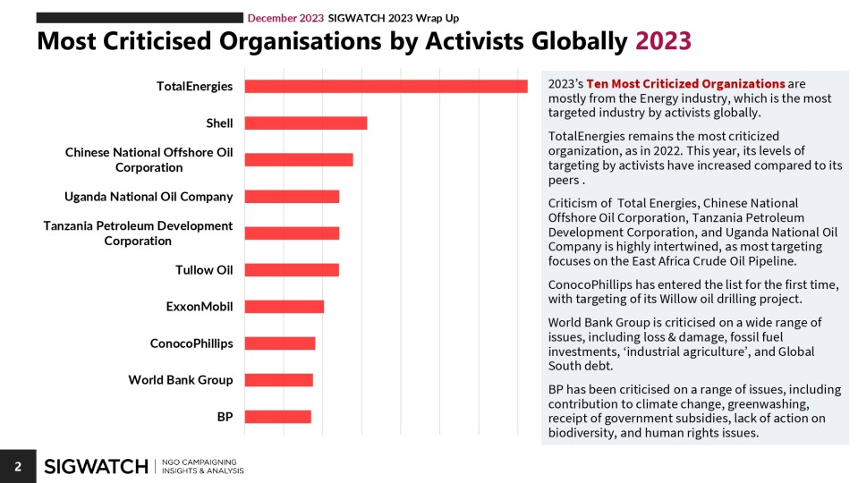 The “Most Criticized Organizations by Activists Globally 2023” spotlight energy industry giants, with TotalEnergies retaining its position as the most criticized organization. Notably, the top ten features companies with increased targeting levels compared to the previous year. Criticism is notably concentrated around the East Africa Crude Oil Pipeline, impacting TotalEnergies, Chinese National Offshore Oil Corporation, Tanzania Petroleum Development Corporation, and Uganda National Oil Company. ConocoPhillips makes its debut due to its Willow oil drilling project.