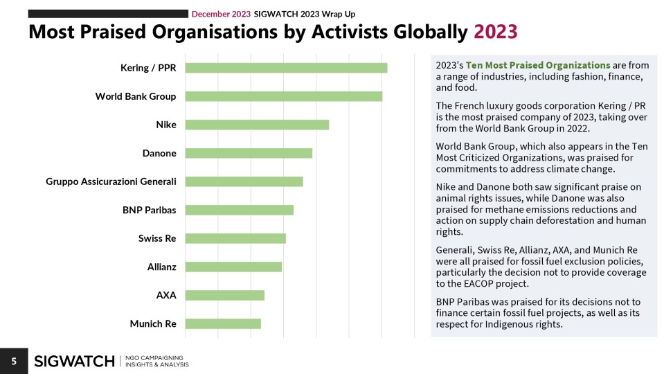 In a balanced narrative, SIGWATCH acknowledges the “Most Praised Organisations by Activists Globally 2023.” Kering / PPR, a French luxury goods corporation, claims the top spot, displacing the World Bank Group from its 2022 position. The World Bank Group, despite criticism, receives praise for its commitments to combat climate change.