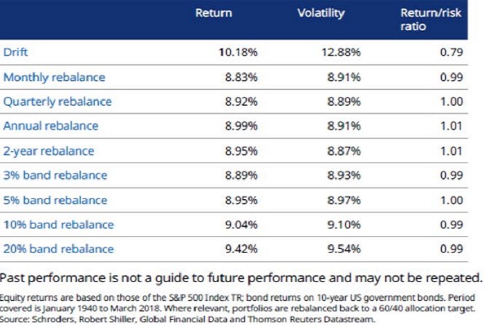 For the purposes of our illustration, we have ignored such costs, but we acknowledge that they can be substantial enough to outweigh the benefits of rebalancing. Choosing the optimum rebalancing strategy therefore involves a trade-off between the best risk-adjusted returns and the lowest level of costs consistent with achieving those returns.