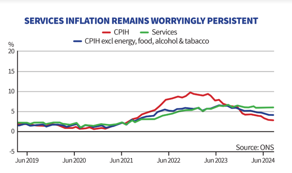Although inflation has come back down to target, services inflation remains worryingly persistent and does not yet show signs of normalising. The latest figures showed it remained stuck at 5.7 per cent in June.