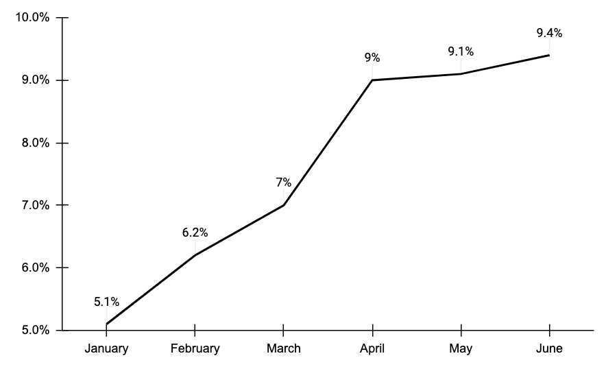 Prices are up 9.4 per cent over the last year, the quickest acceleration since 1982. That has prompted the Bank of England to hike interest rates five times in a row to a 13-year high of 1.25 per cent, adding to the squeeze on households and businesses.