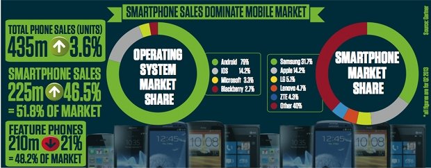 Smartphone sales grew by 46.5 per cent compared to the same period in 2012, eating into sales of so-called feature phones, which fell by 21 per cent year-on-year.