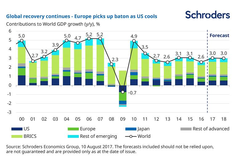 Looking into 2018, global growth is expected to remain stable at 3% with modest downgrades to the US, offset by upgrades to the eurozone and emerging markets.