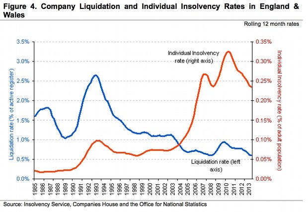 It appears that the rate of individual insolvencies is beginning to recover with some conviction from the sharp rise between 2004 to mid-2010 – but is still far above the long term average. In the year ending the second quarter 2013, one in 427 adults became insolvent – down from one in 418 the year before.