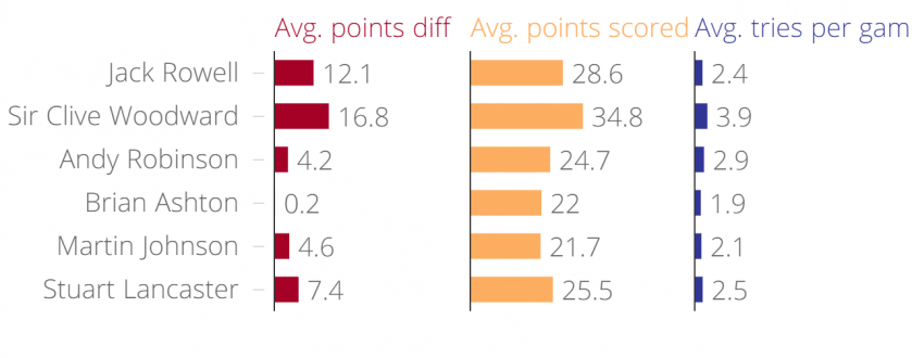 The last England head coach to match such numbers? You guessed it: Woodward (although under Andy Robinson the team did average 2.9 tries per game).