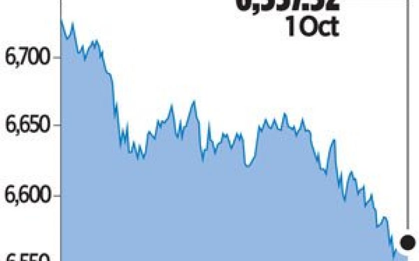 The blue-chip FTSE 100 index fell one per cent, or 65.20 points, to 6,557.52 points – its lowest closing level since 15 April.