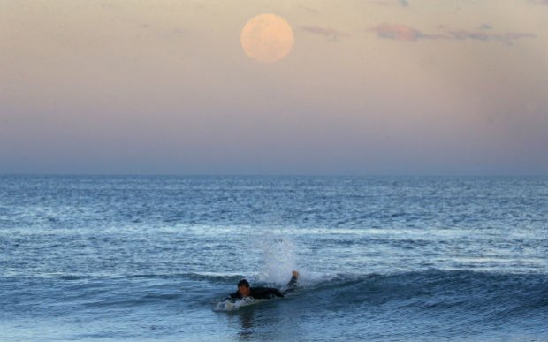 Surfers in Sydney, Australia, underneath the 10 August supermoon (Source: Reuters)