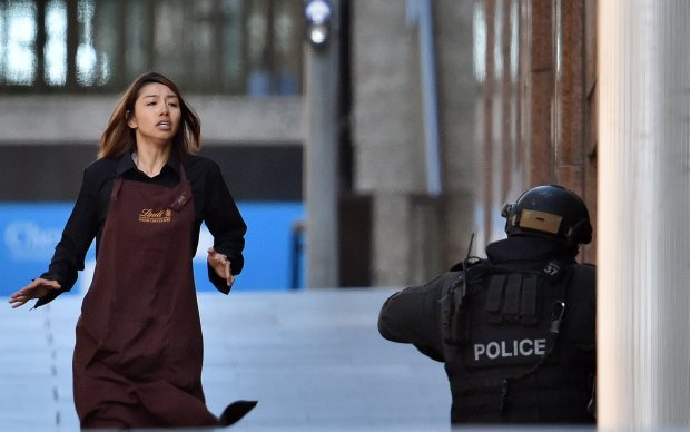 A woman in a Lindt uniform was seen escaping from the cafe (Source: Getty)
