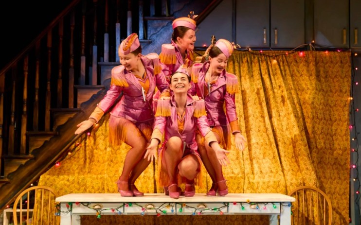After the first act, the stage unexpectedly rotates, carrying away the sad tiki bar and chintzy juke box to reveal a 1950s kitchen containing the sisters – all four of them – as children. We learn that they were trained, fairly relentlessly, by their mother to perform song and dance numbers in the style of the Andrews Sisters. Living vicariously through her offspring, Veronica has placed every one of her eggs in this precarious basket, desperate to see them succeed.