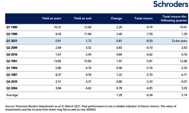 This works the other way too. As an indication, if half of the recent 10-year yield rise reversed, with duration at about 9.4 (the Q1 average, according to Datastream), this would result in a return of over 3.5% (9.4 times 0.4).
