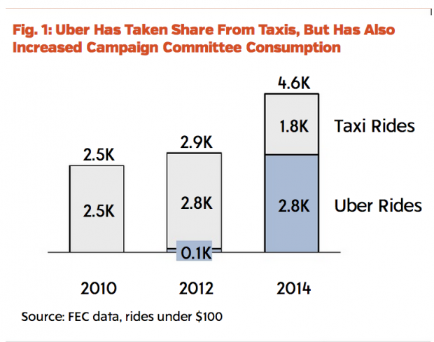 In 2012, there were only 100 Uber trips in that price range, but this year it soared to 2,800, overtaking regular taxis in both numbers and the amount of money spent. Furthermore, the analysis didn't include the final two months of the campaign, so the rise of Uber could be even greater than these numbers suggest.