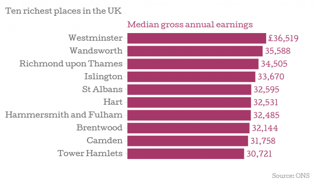 Unsurprisingly perhaps, eight of the 10 richest local authorities in the UK were in London, including each of the top four.