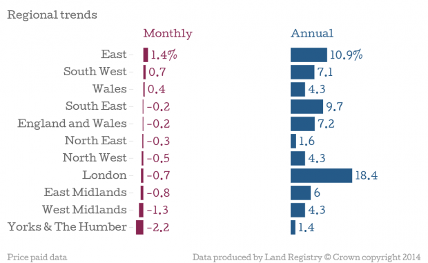 As always, there were regional differences. London, the fastest growing region over the last year, actually experienced negative growth this month. The fastest-growing region was the East at 1.4 per cent.
