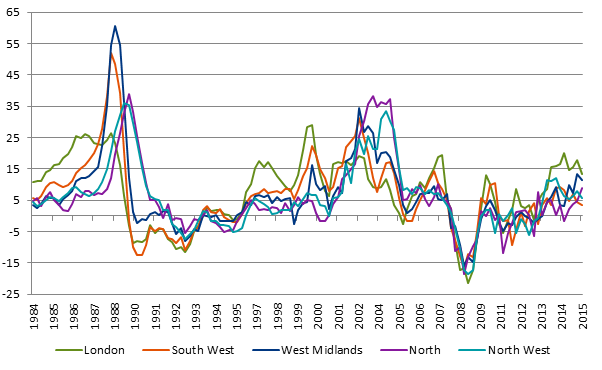 One recent trend to note is that the London housing market has gone from the fastest growing region to one of the slowest. However, the house price ‘ripple effect’ that used to spread outwards from London no longer appears to hold, as you can see from the chart below.