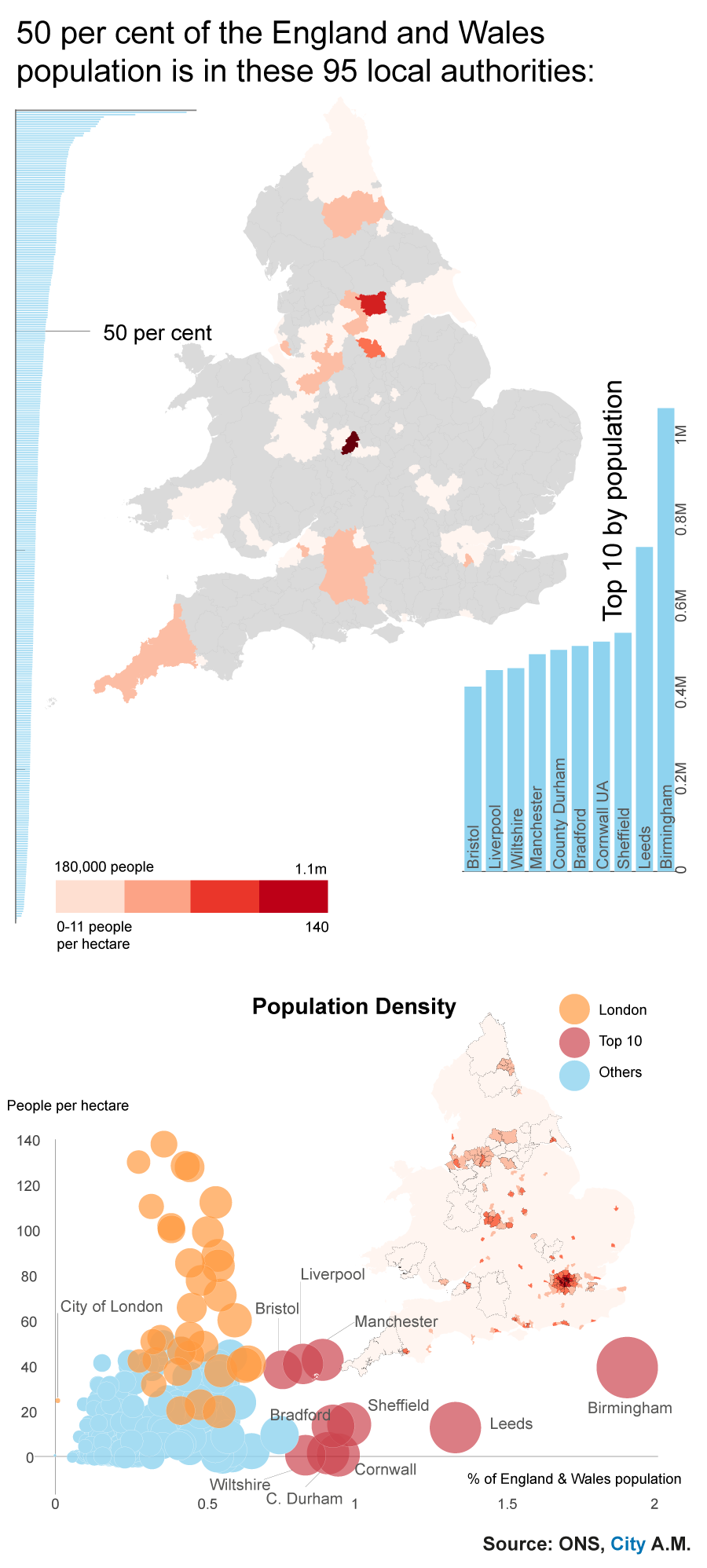 The bubble graph at the bottom of the graphic shows local authorities by percentage of the England and Wales population, charted against the population density. The size of the bubbles represents the first of those two values. London boroughs are concentrated towards the low population end of the scale, but are high up as their density is greater, as you’d expect.