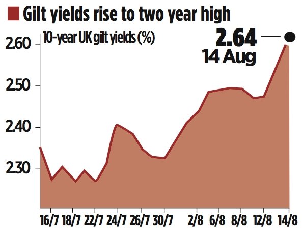 The Bank also revealed that one member of the monetary policy committee, Martin Weale, had challenged the details of the promise to keep rates low. Though he was outvoted 6-1, the news caused sterling and UK bond yields to jump further yesterday. The pound rose 0.41 per cent against the dollar and 0.44 per cent against the euro, while yields on the UK’s 10-year gilts hit 2.64 per cent, the highest since 2011, tightening monetary policy, the opposite of what Carney was seeking to achieve.