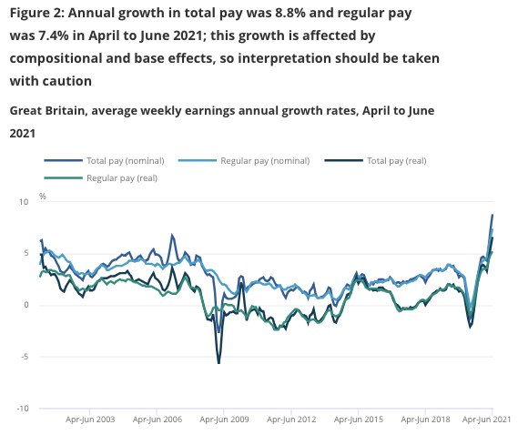 Average earnings flew over the last quarter, driven by a large proportion of the workforce coming off furlough and having their pay restored to pre-Covid levels.