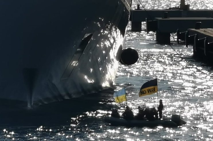 The luxury vessel called Solaris was confronted in the resort of Bodrum by a rubber dingy filled with children and teens, holding Ukrainian flags with the slogan, “no war”.