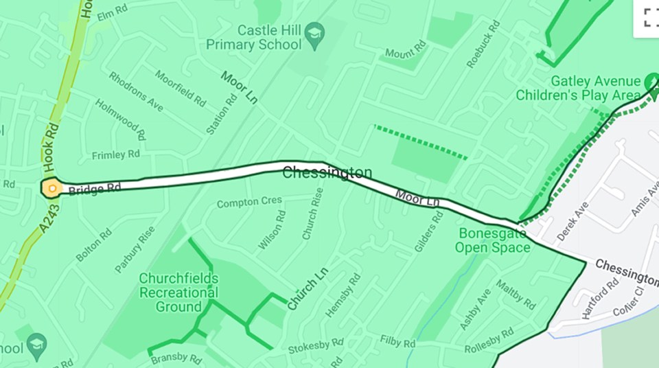 Motorists travelling along Moor Lane which becomes Bridge Road in Chessington, south-west London, do not have to pay the Ulez charge, but should they turn off at any stage they will immediately enter the zone.