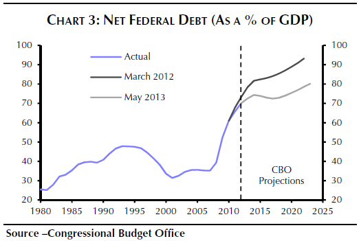 The sharp fall in the size of the deficit means that America is no longer expected to reach a debt ratio of 100 per cent of GDP. The current ratio of debt to GDP of 73 per cent is double what it was before the recession but high demand for US debt does not make this a worrying figure.