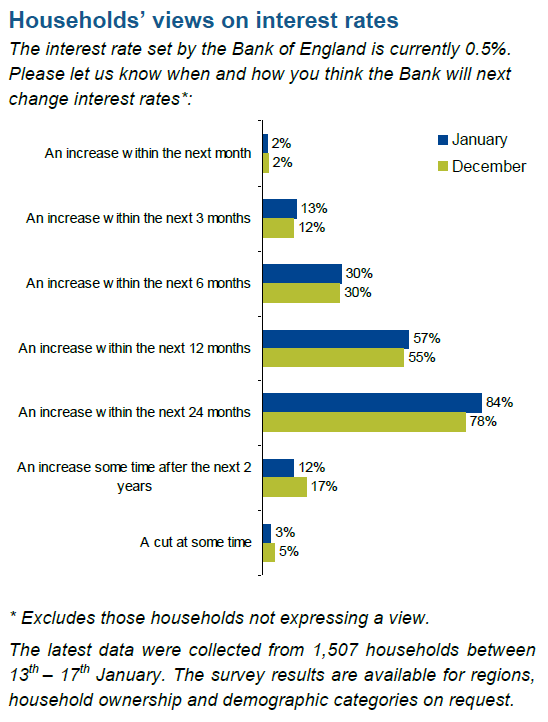 Over half of people expect interest rates to rise over the next 12 months, according to a Markit survey published today. This figure is now up to 57 per cent – and after today’s positive news on unemployment, who’s to say that two-thirds of Brits won’t soon believe that a rate hike is coming this year?