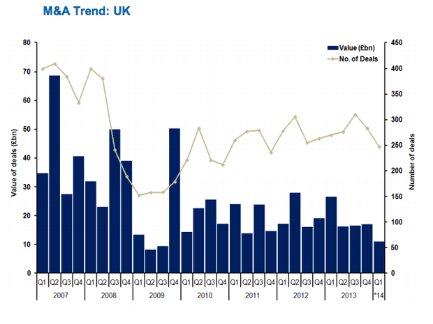 In fact, UK M&A actually dipped in the first quarter of 2014, representing the lowest quarterly value since 2009, and the worst opening quarter since Mergermarket began recording the data (2001). The absence of mega-deals, Mergermarket says, is responsible for the recent decline.