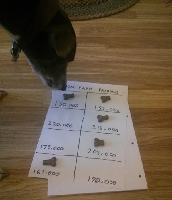 We'll be using longdog Blue to guess the monthly NFP figure. Blue is five years old (35 in dog years), and belongs to our economics reporter, Mike Bird.