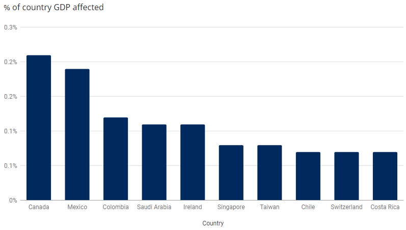 Top 10 countries most affected by Chinese tariffs on US goods via supply chains