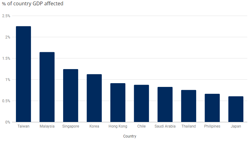Top 10 countries most affected by US tariffs on Chinese goods via supply chains