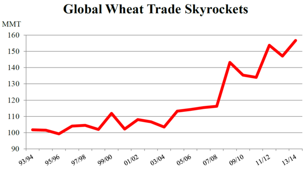 Explaining the dramatic increase in cereals prices requires an understanding of the primary drivers of supply and demand – and there has been a gargantuan increase in the latter. The USDA's most recent grain report states that the global wheat trade has risen by more than 50 per cent in just 10 years. "Expanding populations, rising incomes, changing tastes, and government policies" have contributed to phenomenal demand in the Middle East, North Africa, and Sub-Saharan Africa.