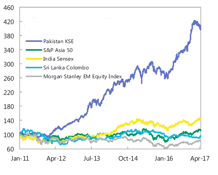 Political turmoil has not helped Pakistan’s equity market. The prime minister resigned after Pakistan’s Supreme Court disqualified him from office due to corruption, and the former finance minister faces graft charges. The credibility of the government has been greatly weakened.