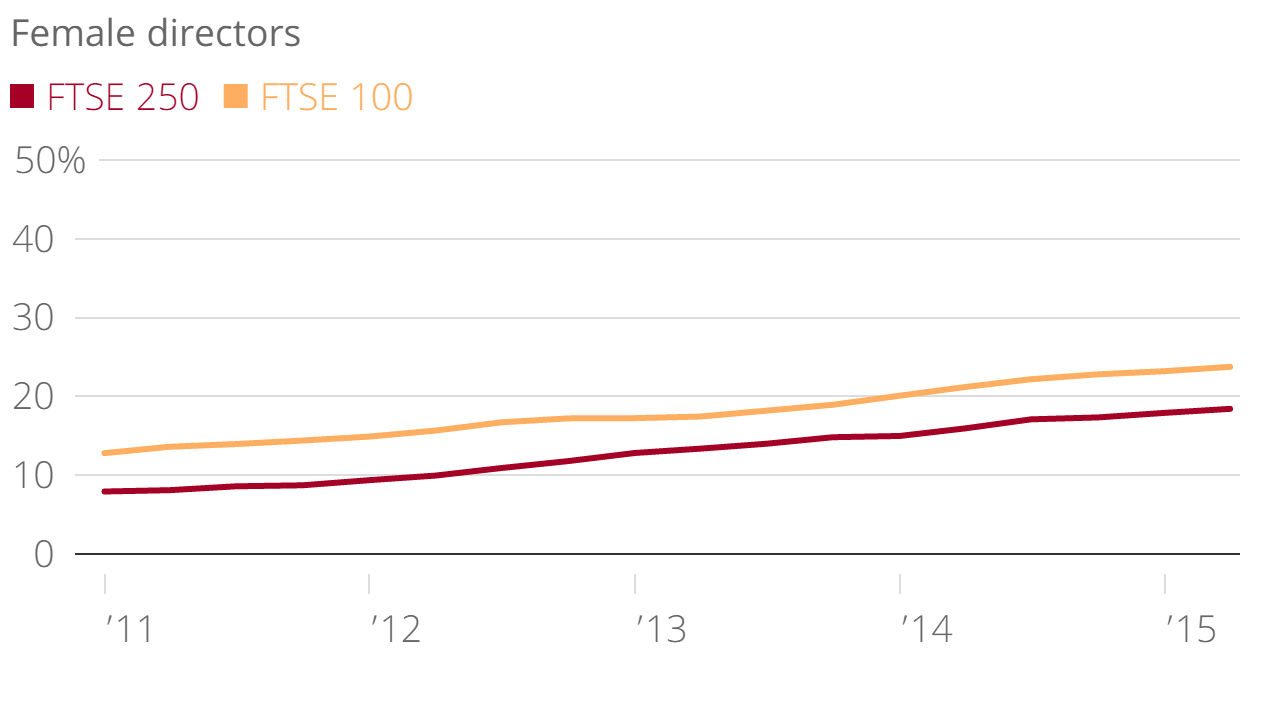 Gender diversity has also increased on FTSE 250 companies’ boards. No particular target has been set out for these, but Norman Broadbent estimated they would reach 25 per cent by 2017.