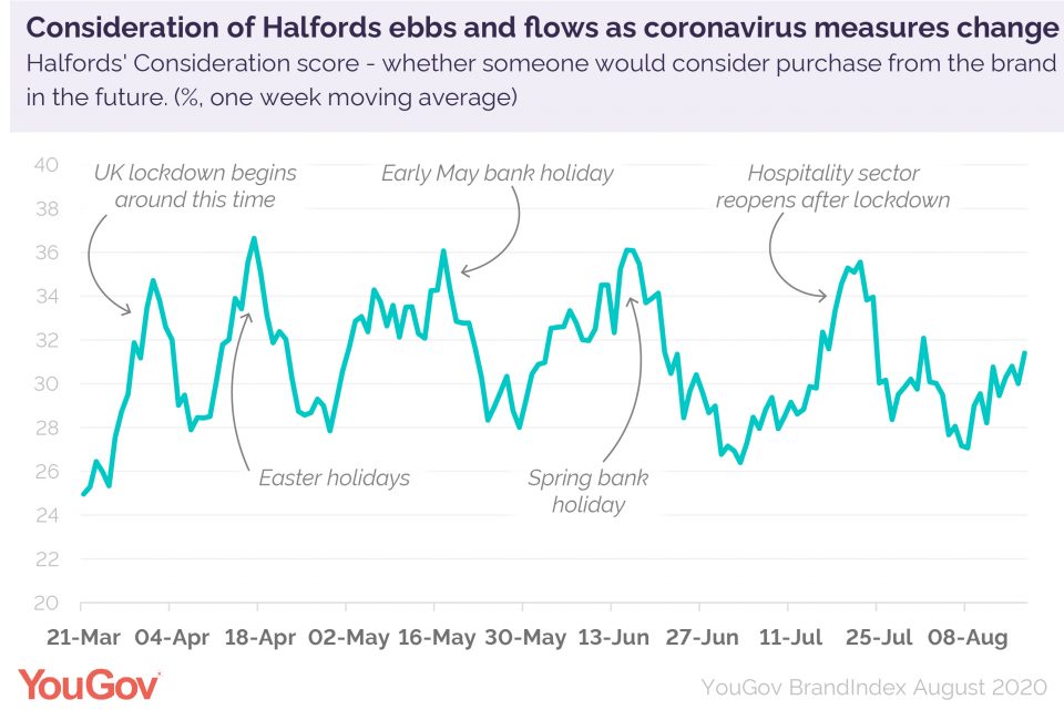 Since lockdown began to ease in July, and Britons were no longer encouraged to avoid public transport, Consideration scores started to decline for Halfords. However, at the end of July the Government launched the long-awaited bike repair scheme offering £50 vouchers to cyclists in an effort to relieve pressure of public transport and reduce air pollution.