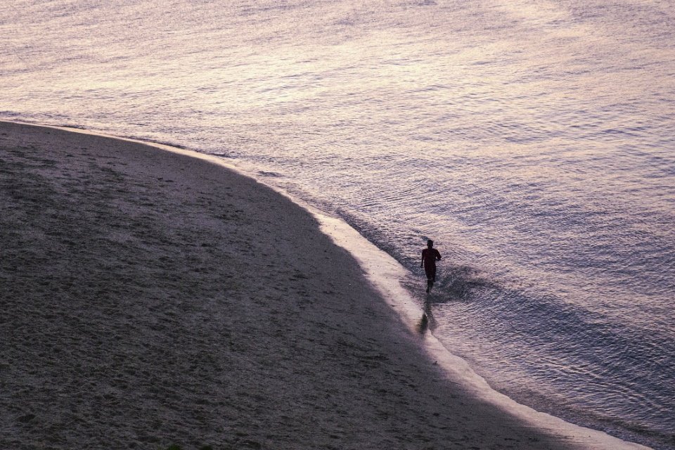 A lone jogger on the beach at dawn